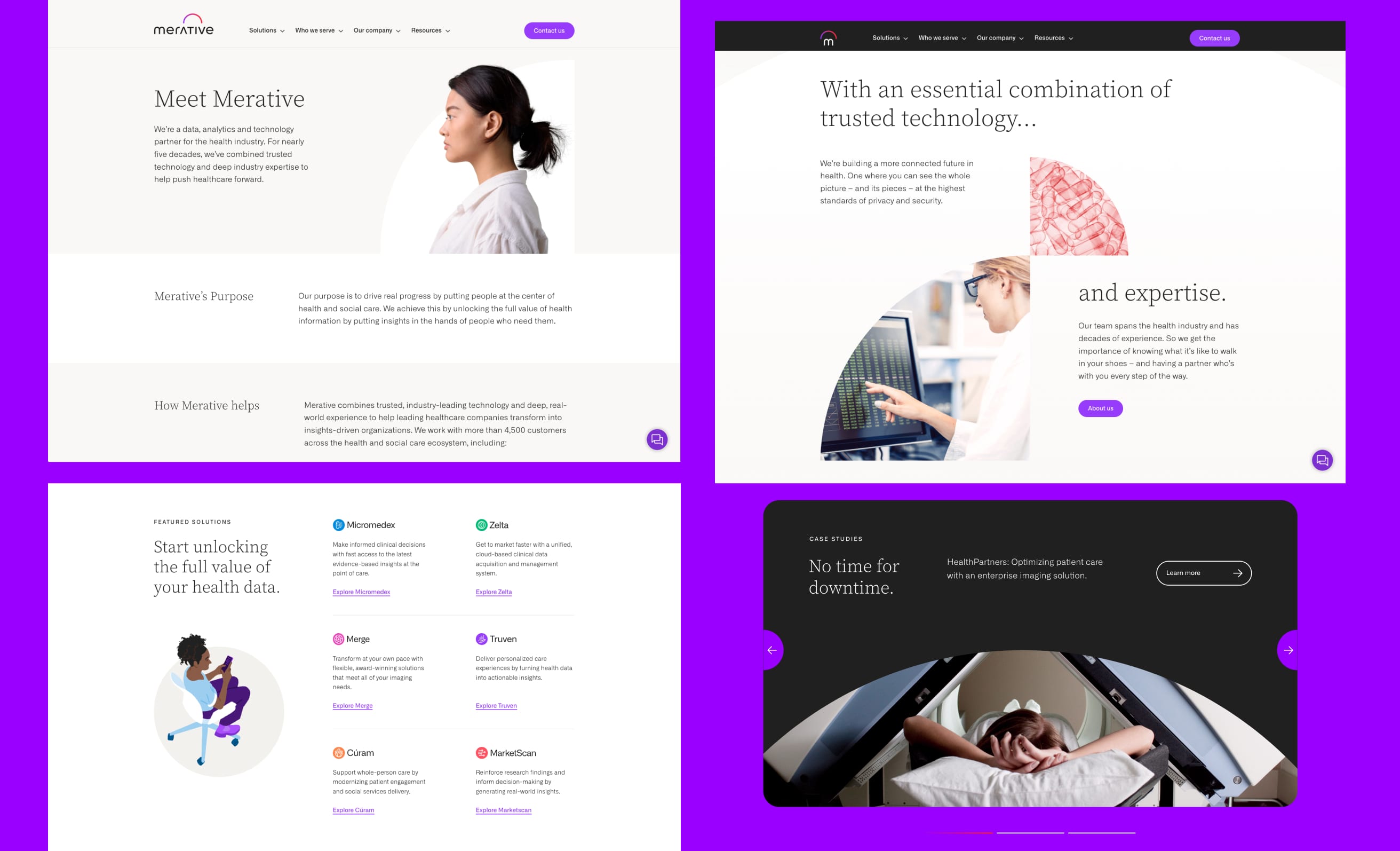 Across the design system, Merative’s identity system leverages colors, typography, graphic motifs, and photography that reflect both the deeply humanistic and advanced technological capabilities of Merative.